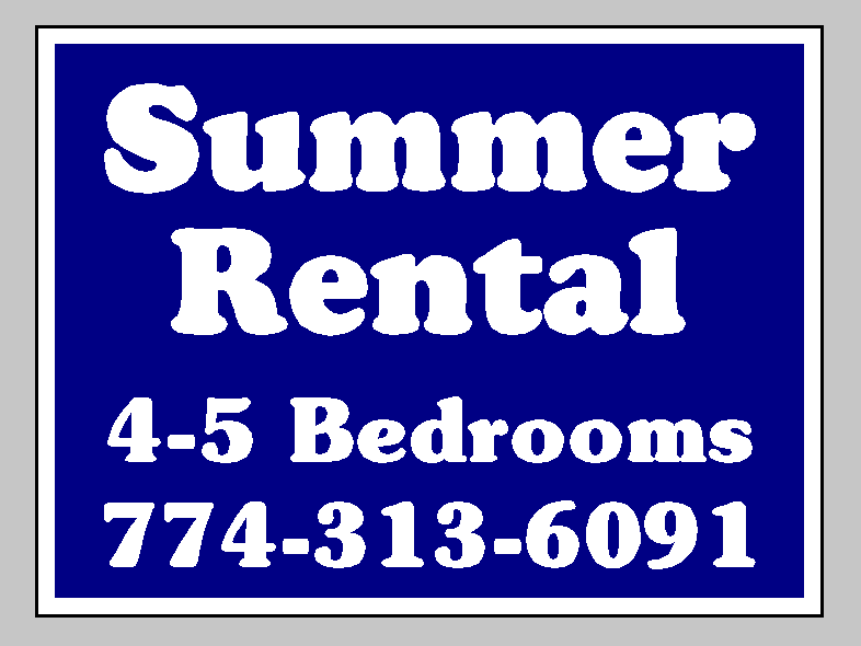 Sign Details: Corrugated Plastic Yard Sign Size 18 inches by 24 inches; Color Navy Blue with White lettering; Desired Fonts and Text Broadside font Bold Text Summer Rental 4-5 Bedrooms 774-313-6091