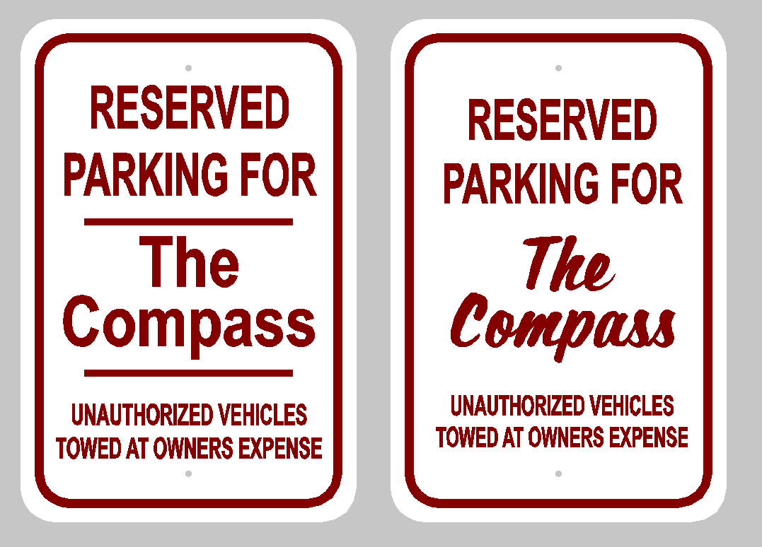 Sign Details: Metal Aluminum Sign; Color Burgundy/White; Size R or NR 12 x 18/NR; Desired Fonts and Text RESERVED PARKING FOR ___________ The Compass ___________ UNAUTHORIZED VEHICLES TOWED AT OWNERS EXPENSE;