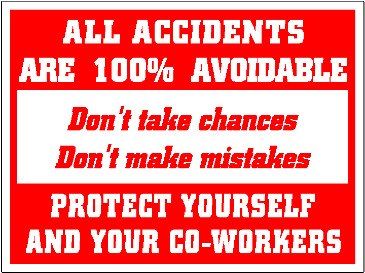 Product = Metal Sign Options = Type of Sign18″ x 24″; Colorwhite; Size R or NRNR; Desired Fonts and TextALL ACCIDENTS ARE 100% AVOIDABLE Don’t take chances Don’t make mistakes PROTECT YOURSELF AND YOUR CO-WORKERS Red font in the Boroughs style. Would like the all-caps text to be slightly larger than the middle section. Thanks! ;