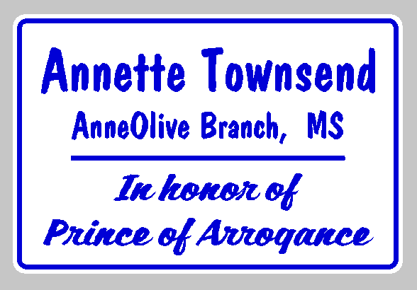 Product = Metal Sign Options = Color Forest Green; Size R or NR NR 6 ” x18 “Desired Fonts and Text Dom Casual Annette Townsend; Olive Branch; MS in honor of Prince of Arrogance;