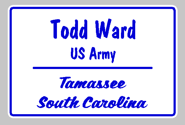 Product = Metal Sign Options = Color Forest Green; Size R or NR NR 6 ” x18 “Desired Fonts and Text Dom Casual Todd Ward; US Army; Tamassee; South Carolina;
