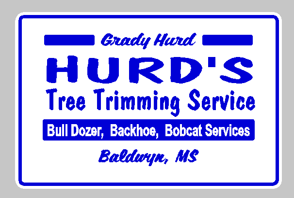 Product = Metal Sign Options = Color Forest Green; Size R or NR NR 6 ” x18 ” Desired Fonts and Text Dom Casual Grady Hurd; Hurd’s Tree Trimming Service; Bull Dozer; Backhoe; Bobcat Services; Baldwyn; MS;
