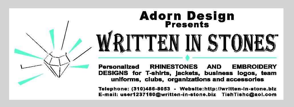 Banner details; Size 2×6; Colors White Black and Teal; Desired Fonts and Text Adorn Design (arial Black-small font) Presents (arial Black -smaller font) Written In Stones (morocco- Largest font) (Put a graphic of a Large Diamond I can send you this graphic Please email me I will send the attachment) Personalized RHINESTONES AND EMBROIDERY designs for T-shirts; jackets; business logos; team uniforms; clubs; organizations and accessories (arial bold font)