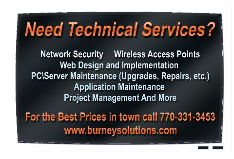 Size 12 inch by 18 inches; Color White; Desired Fonts and Text Arial Bold Need Technical Services? Network Security Wireless Access Points Web Design and Implementation PCServer Maintenance (Upgrades; Repairs; etc.) Application Maintenance Project Management And More⦠For the Best Prices in town call 770-331-3453 www.burneysolutions.com