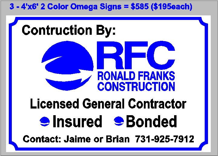 Let me know if you have any questions, changes, or ideas and I'll send another layout. Once we get the final 'go ahead' it will be one week till completion. Give me a call or email me when you get a chance (888-708-0021 or mail@signspecialist.com