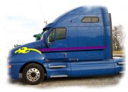 Our Graphic Stripe Department stripes to match your ride. From flame graphics, checkered racing decals, tribal art designs, lightning bolt stripes, freehand splash effects, to your simple flemish pinstripe, we design it all. With 1,000's of templates from our digital auto library, we can draw your graphic to scale. Our striping is not some "off the shelf stock item". These stripes and graphics are designed to fit your Semi