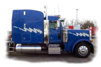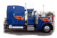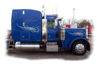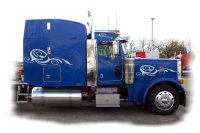 Our Graphic Stripe Department stripes to match your ride. From flame graphics, checkered racing decals, tribal art designs, lightning bolt stripes, freehand splash effects, to your simple flemish pinstripe, we design it all. With 1,000's of templates from our digital auto library, we can draw your graphic to scale. Our striping is not some "off the shelf stock item". These stripes and graphics are designed to fit your Semi